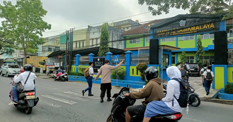 Tasik Kota. - Dalam rangka memberikan pelayanan kepada masyarakat, Polsek Kawalu Polres Tasikmalaya Kota melaksanakan kegiatan pengaturan arus lalu lintas pagi di beberapa titik rawan kepadatan kendaraan, terutama di Simpang Cicariang dan sekitar SMPN 12 Kawalu.